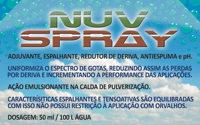 Nuv Spray é um adjuvante, espalhante, redutor de deriva, antiespumante e pH. Uniformiza o espectro das gotas, reduzindo assim as perdas por deriva e incrementando a performance das aplicações. Ação emulsionante na calda de pulverização. Características espalhantes e tensoativas são equilibradas com isso não possui restrições à aplicação com orvalhos. Tecnologia de Aplicação. Entre em contato […]